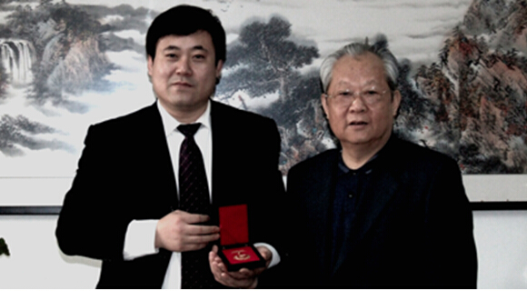 全國工商聯直屬商會會長翟懷明(右)為華強京工董事長張敬剛頒發首都五一勞動獎章